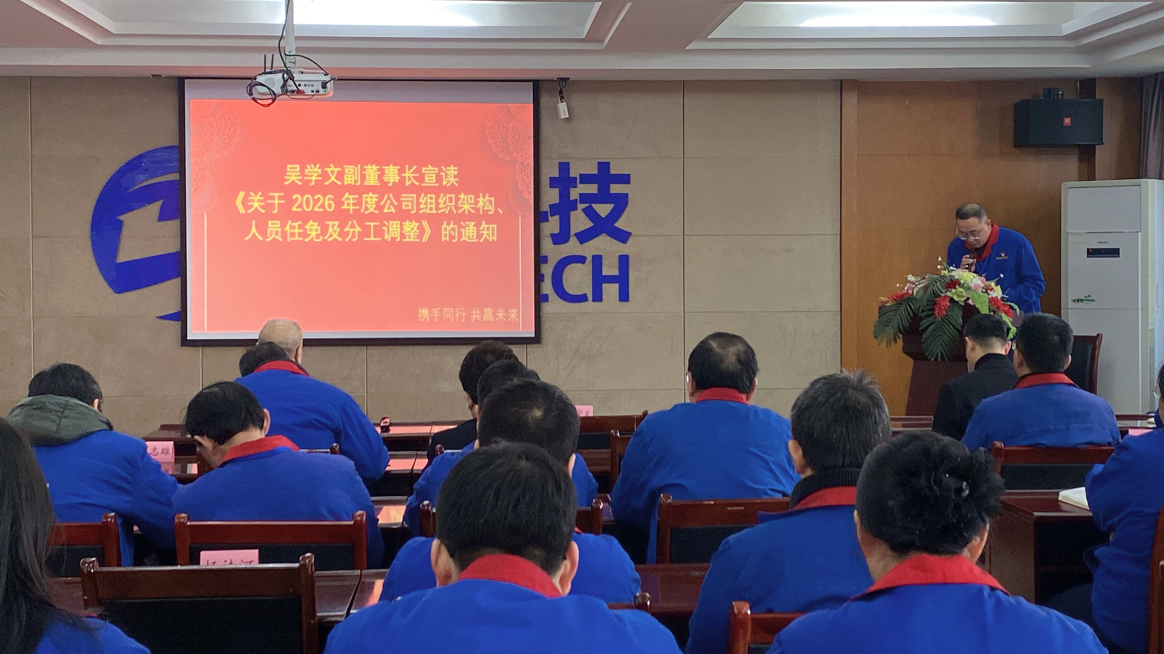 会议伊始,公司副董事长吴学文宣布2026年度战略规划及人事任免,强调面对市场挑战,公司将持续加大技术创新与市场营销投入,优化资源配置,以"焕新"姿态提升组织效能。